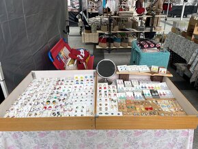 バッグ、イヤリング、ポーチ、腕時計、目覚まし時計、ノート、鉛筆、ピンバッジ、シール、革製品などたくさん二人で作っています。