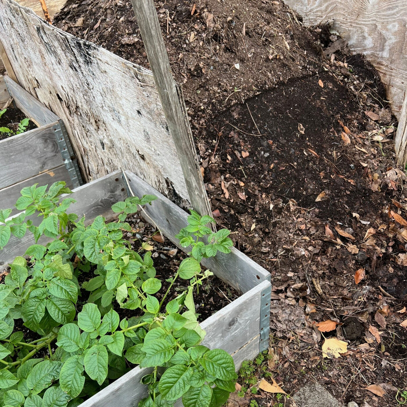 たっぷり降り注ぐ落ち葉を集めて腐葉土作り。日陰で水分と酸素がバランスよく保たれる場所なら積んでおくだけでも分解が進み、2年くらいでほぼ完熟に。菜園やマルチングに大活躍の有機質100%の土です。